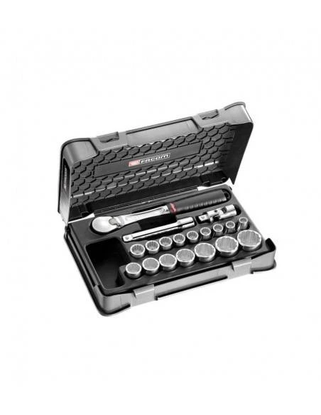 • 16 x douilles 1/2″ 12 pans métriques : S. 10 – 11 – 12 – 13 – 14 – 15 – 16 – 17 – 18 – 19 – 21 – 22 – 24 – 27 – 30 – 32 mm.
